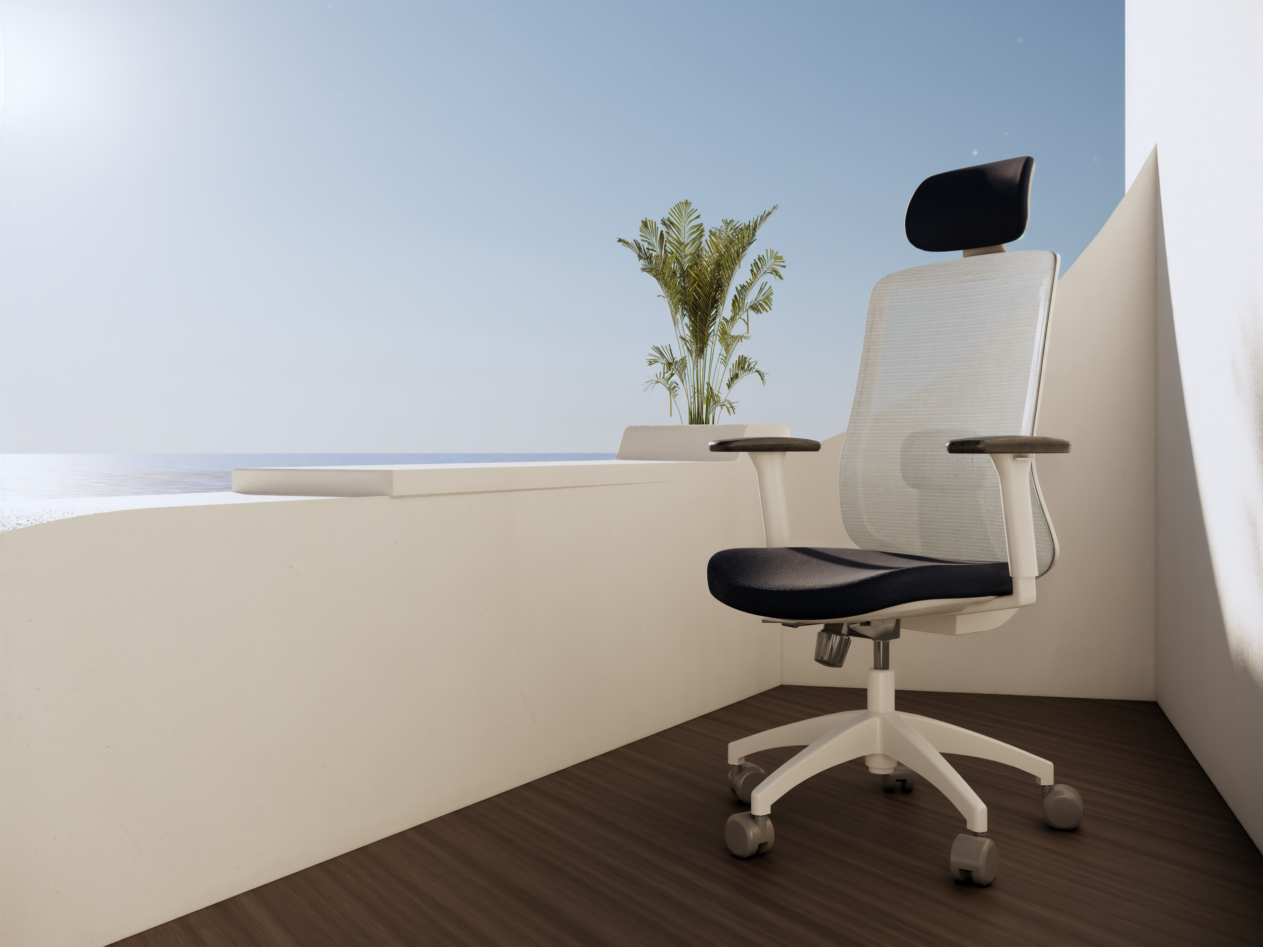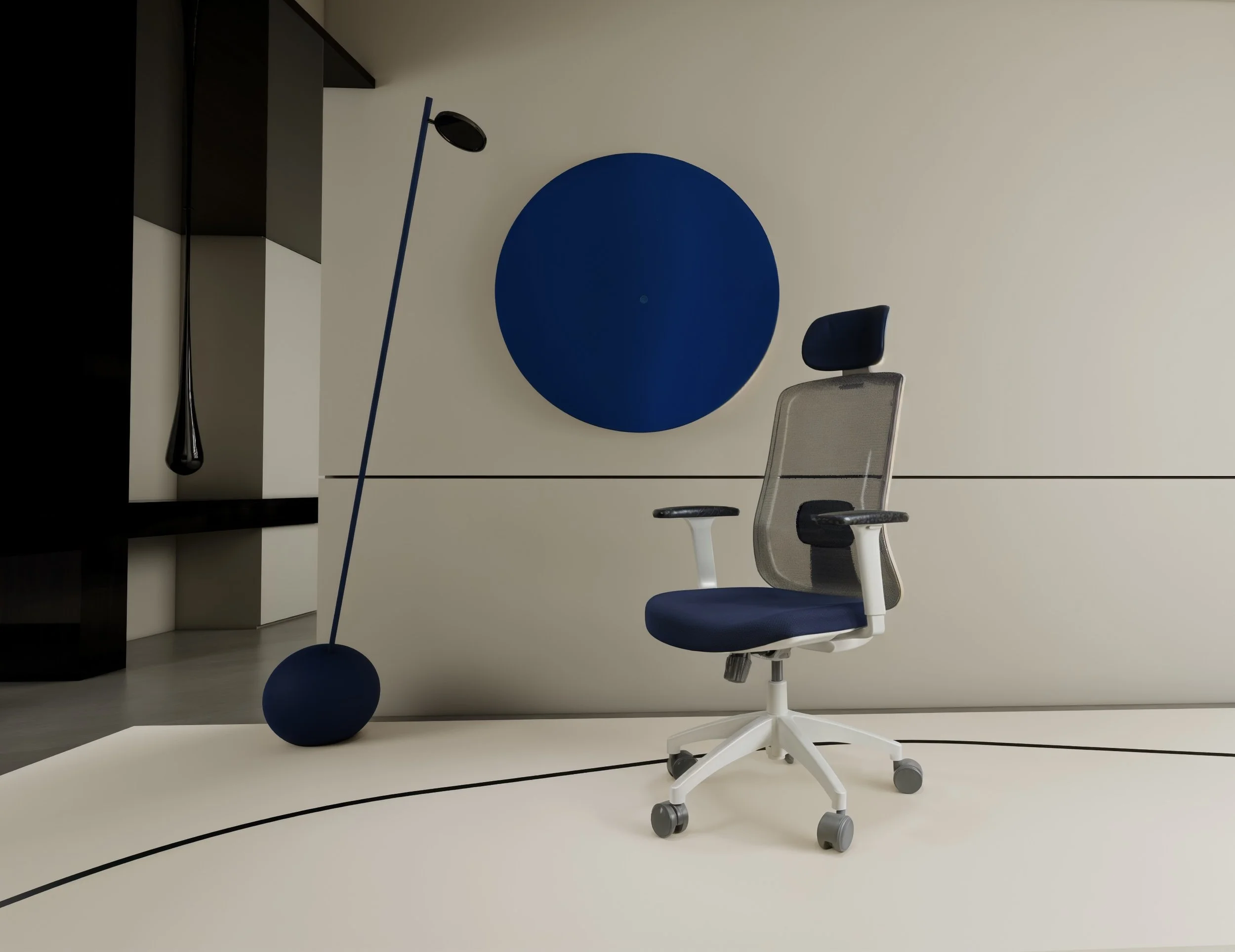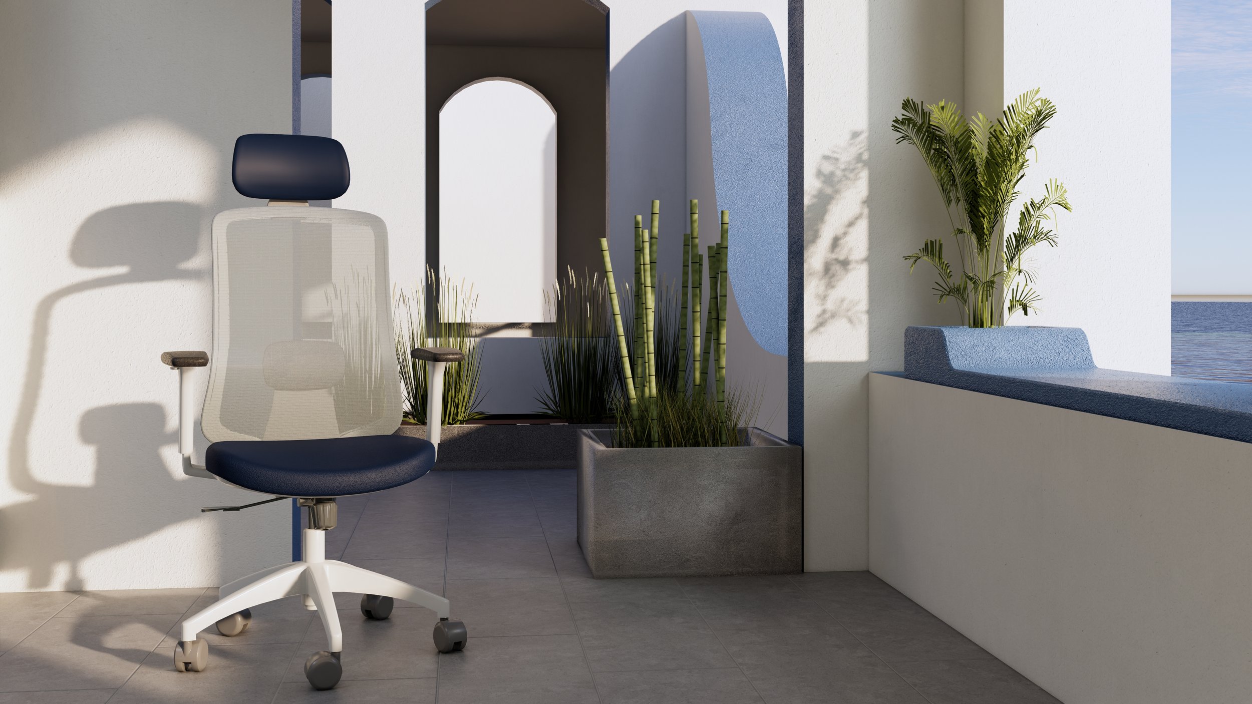 Furniture visualizations focused on office seating and the surrounding spatial atmosphere.